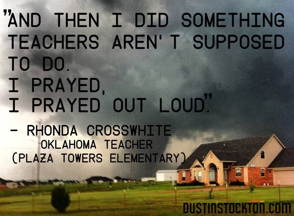 What I want to share is that no matter the depth of your theology, there is a moment to share it and a moment not to share… “To everything there is a season, a time for every purpose under heaven.” (Ecclesiastes 3:1) Why it seems many felt pained connected to those “deleted tweets” was this question, “was this the moment to offer deep thinking on theological concepts, when children had died and adults lost their lives, homes… everything.” The loss these ones had suffered… pictures from Moore, OK can’t even begin to express it, even though they are devastating. When you know Him and have a deep relationship with Him, yes, it is crucial to praise Him in the storms of life as well as in the times of comfort. The reality is that every heart yet does not know Him, and what we reveal of Him in these moments are crucial. Remember how we each connected with Him at the beginning point of our own journey? Maybe it was the revealed love of God, the hope we could have, the doorway into life found through Jesus. The deeper concepts or theological perspectives: meaning, purpose, transcendence, Sovereignty, eschatology etc. are revealed later as we continue to walk out our faith. It is clearly seen here in this circumstance as one woman from the town of Moore, interviewed by CNN, was an atheist and said this in her interview. How can we touch her heart? Many feel that to quote Job, as she is standing in front of the rubble of what was her home, may not be the optimal approach. Maybe, bringing her a meal, or toys or clothes for her toddler would be. I am not judging, simply offering thoughts and vivid realities that our portion as the Body of Christ is so important in these times. As leaders, particularly ones respected and with a reach in voice and scope, must consider that any news outlet could pick up a tweet – void of the intent and run with it – and how then is Christ represented? Also, we must be willing to forgive our leaders when they may have a lapse of judgment connected with timing and tone. Let’s really not do the “tar and feathering” thing to one another. Let’s be quick to forgive. We have important work to do. And so let’s simply ask: how are we responding? Oh, and let it be in offering Hope…